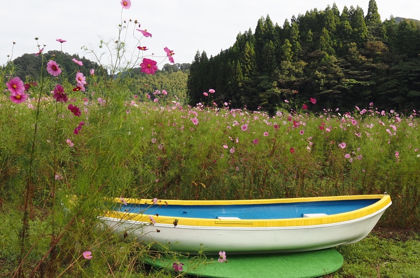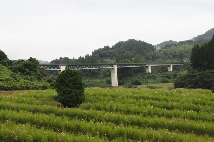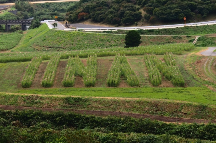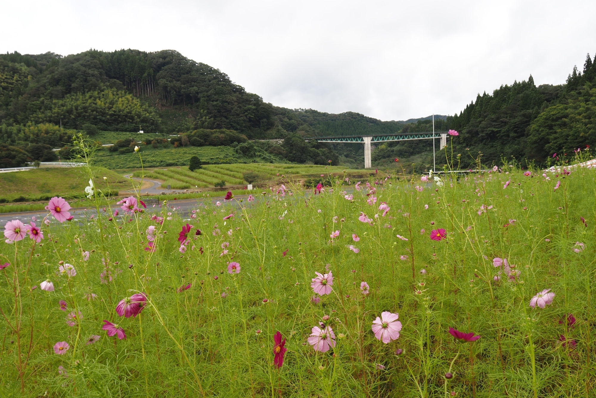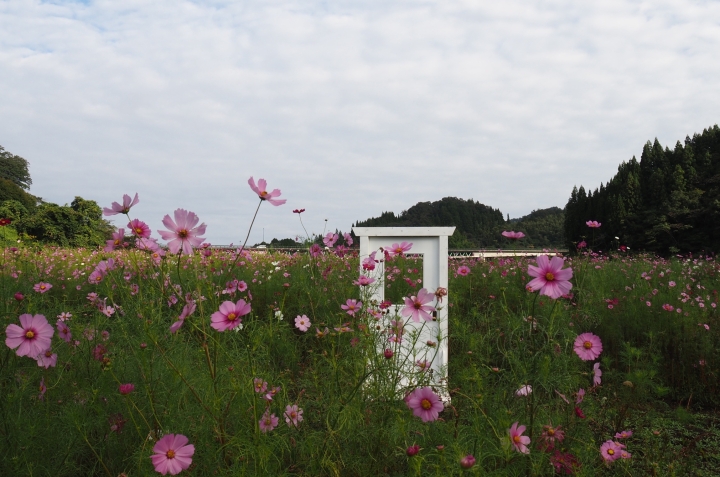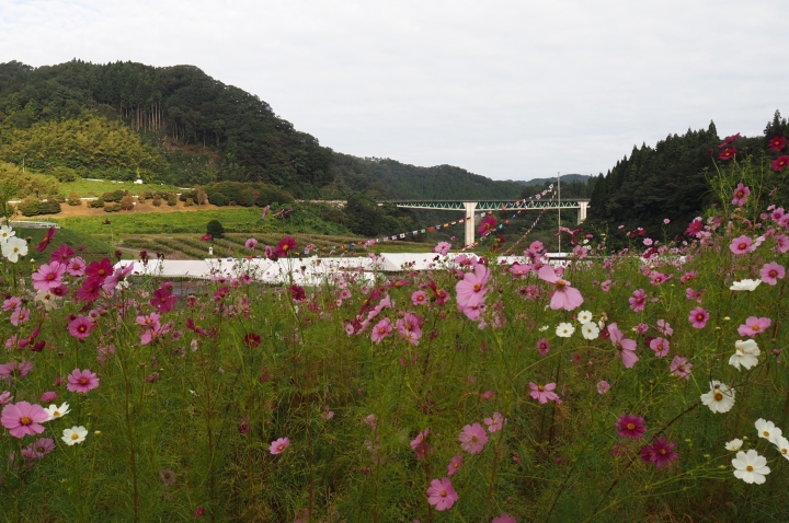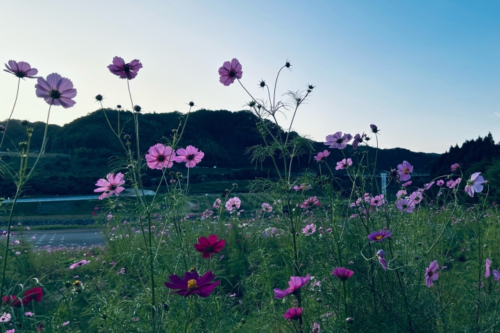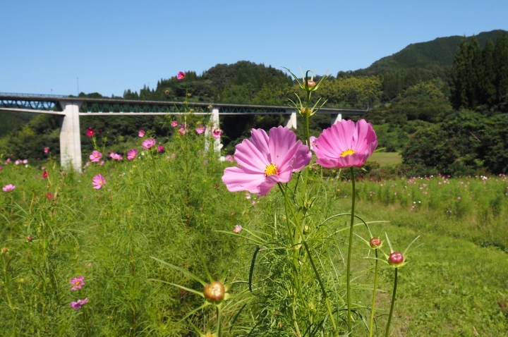コスモスの開花状況(八部咲から満開)10月末までに順次から刈り払われます